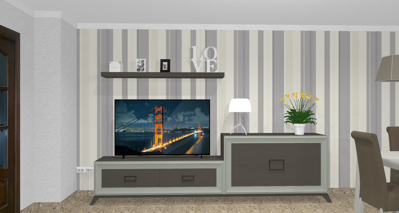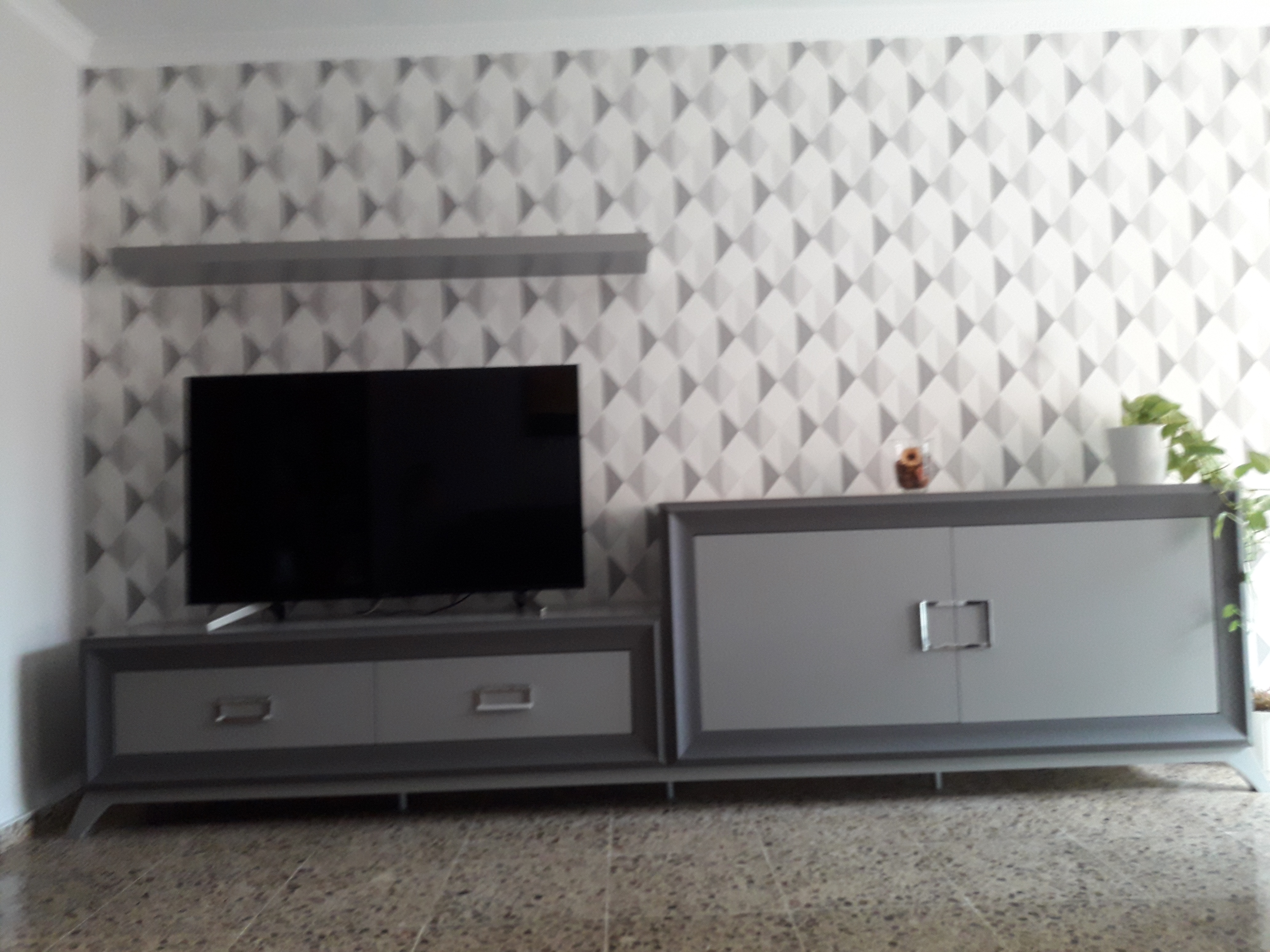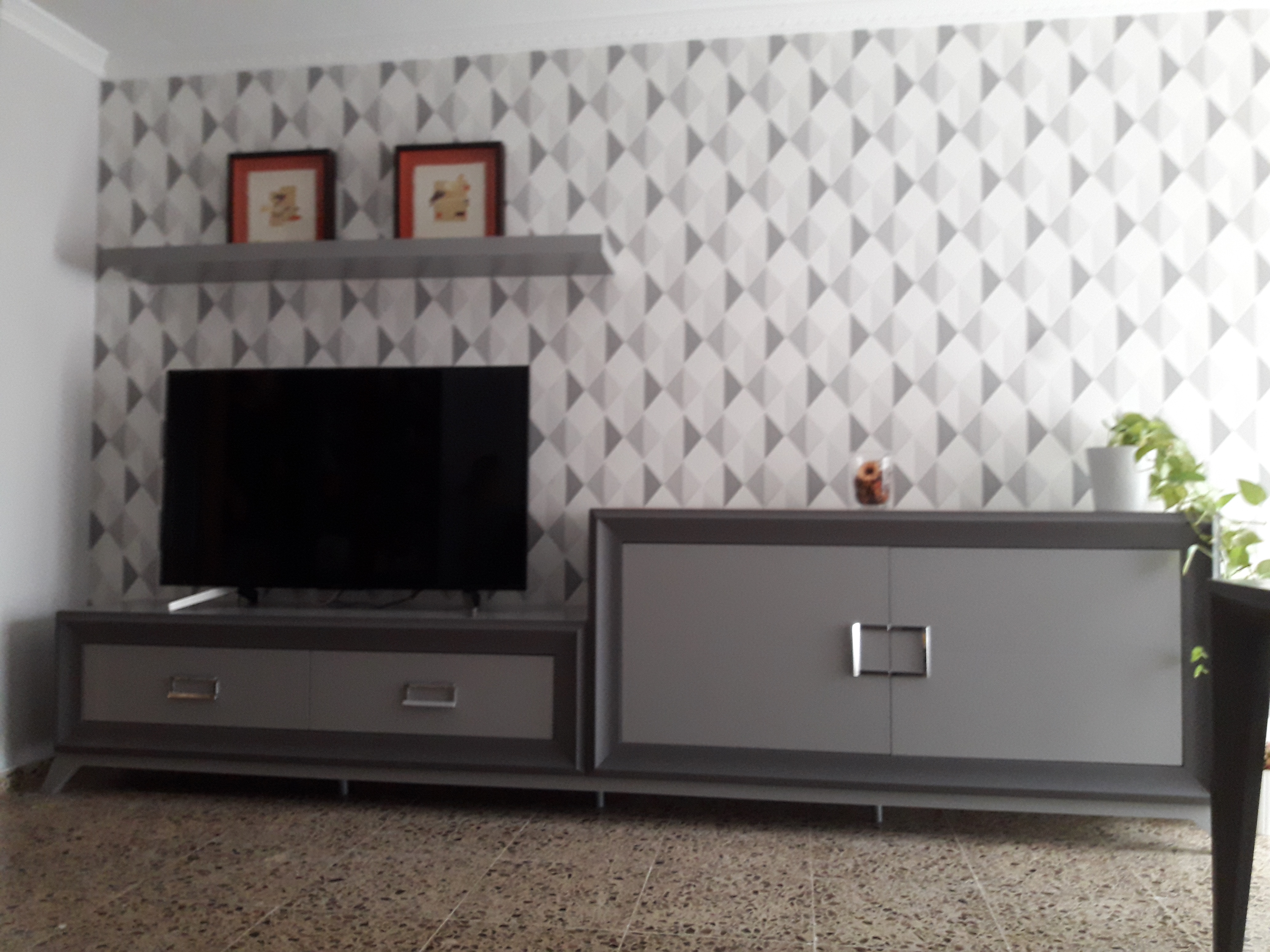 Se ha optado pues, para el papel, de unos dibujos romboides con efectos diédricos que visten adecuadamente la pared sobre la que apoya el mueble. Para el mismo hemos arrastrado los colores del papel con lacados mate en cajas, molduras y base-patas, dandole a los frontales un acabado en roble a poro abierto y así destacarlo del resto.