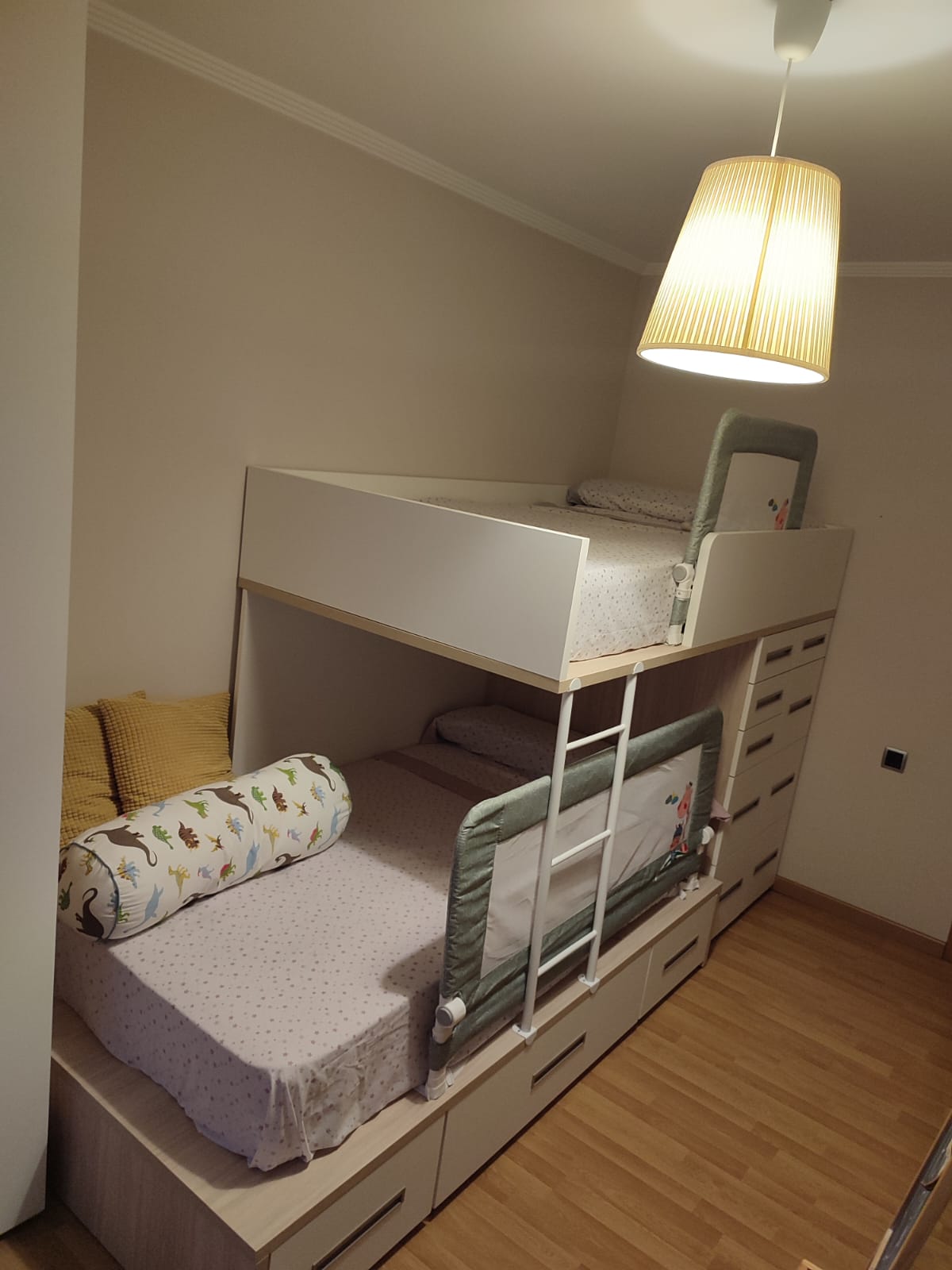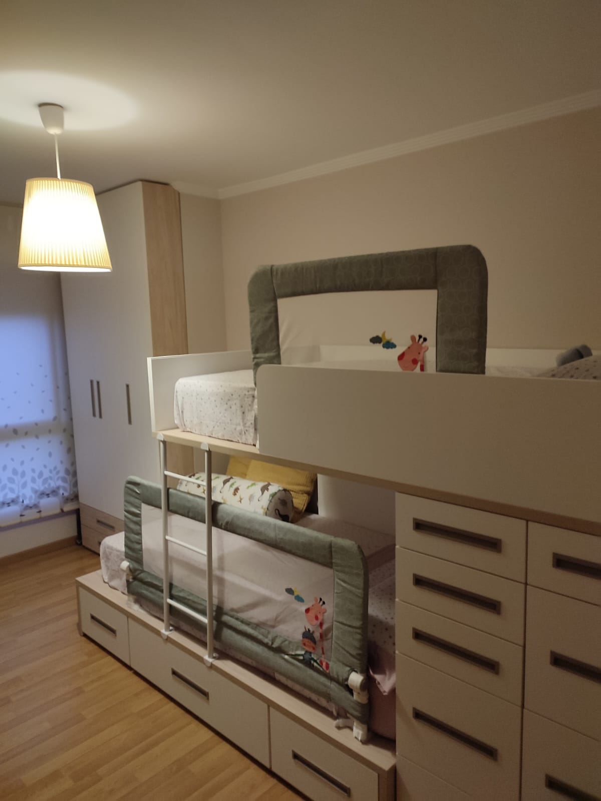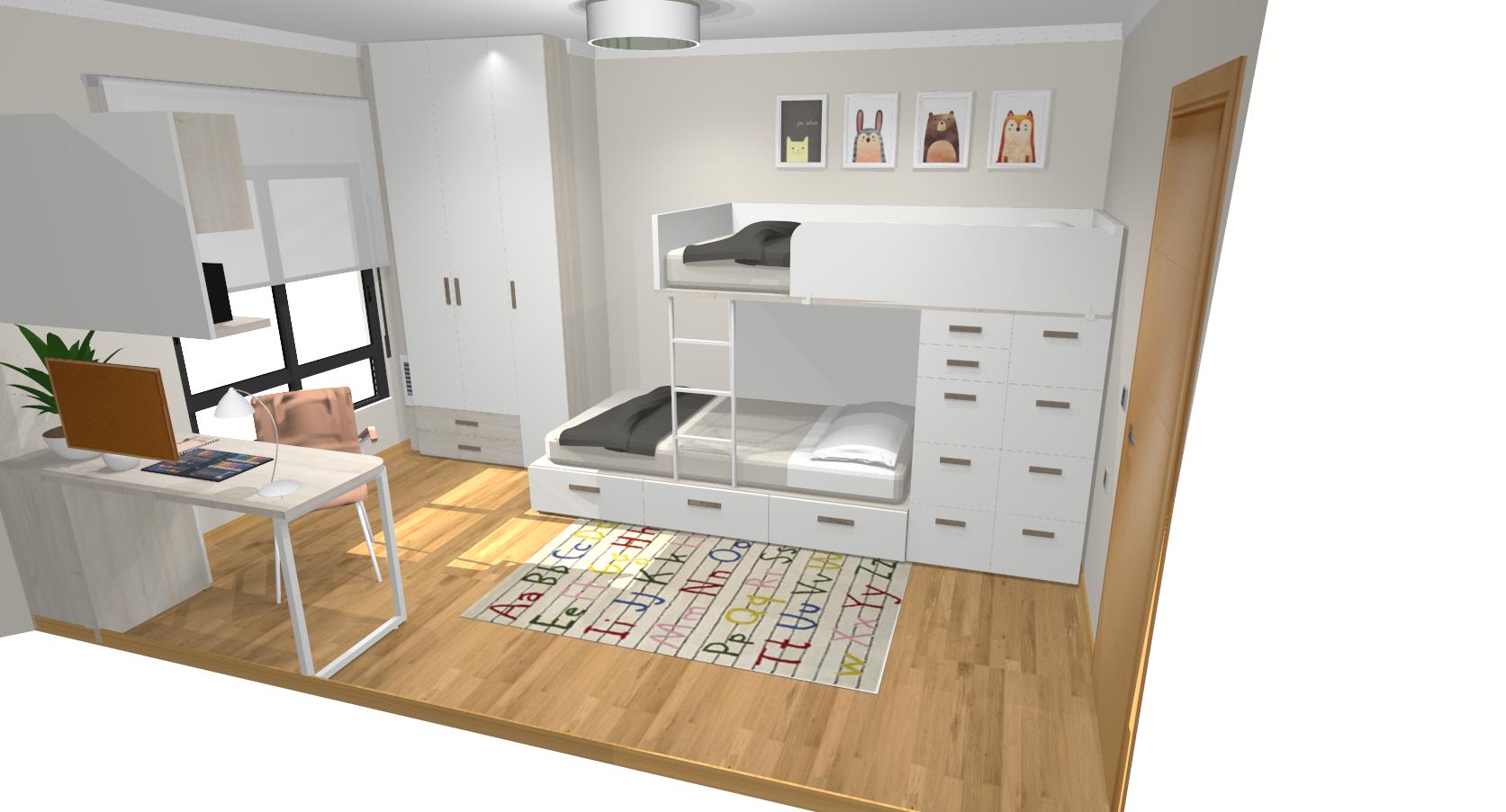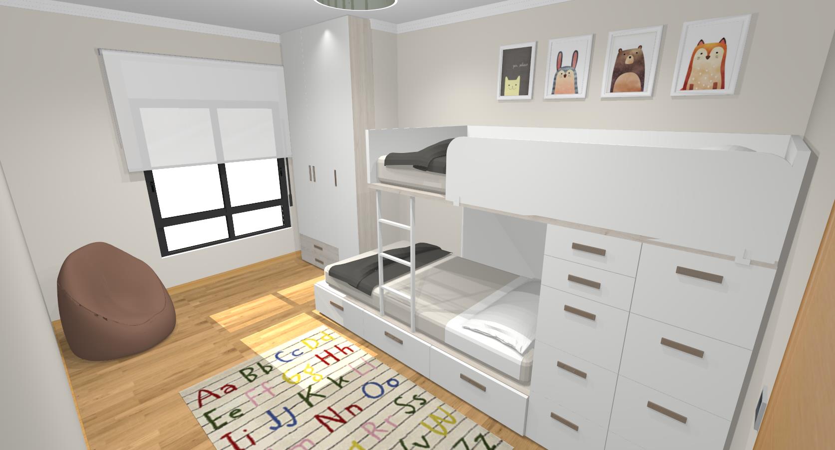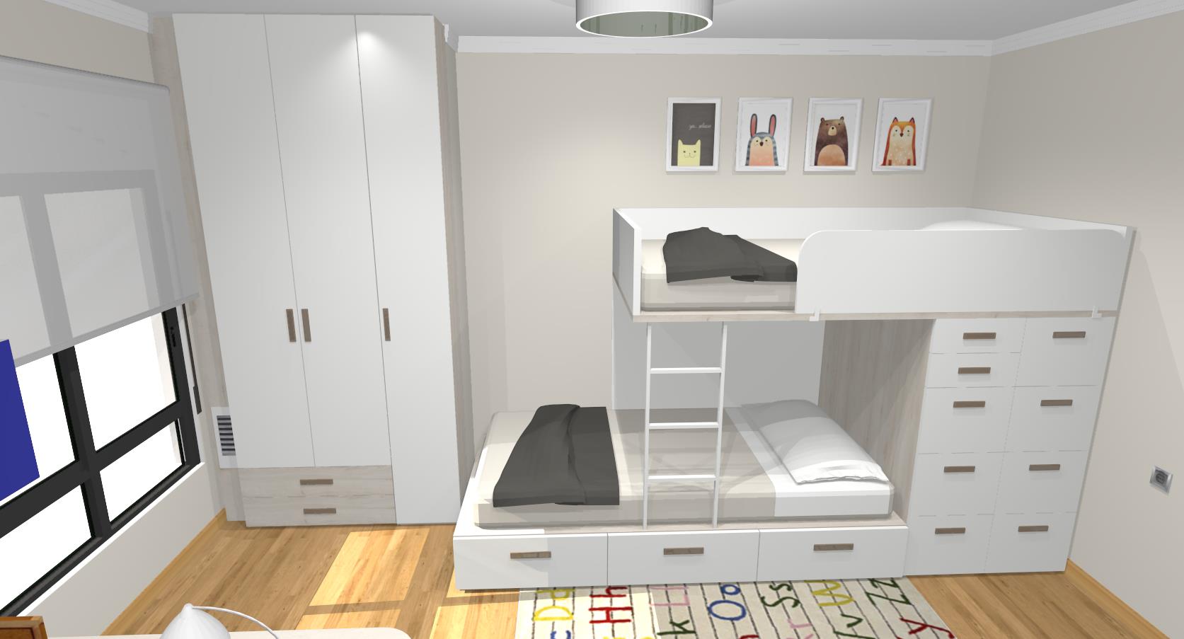 Para el mismo hemos tenido en cuenta la adecuación de dos camas grandes 1.05 x 2.00m. tipo litera tren, en dos alturas, con multitud de cajones y contenedores. Asimismo se ha ajustado, a los pies de las camas, un amplio armario a medida el cual se ha cajeado a un pilar y también se ha tenido en cuenta la rejilla del retorno del aire acondicionado, empotrando la misma a un falseo necesario igualmente para la apertura de la persiana y el estor o cortina.