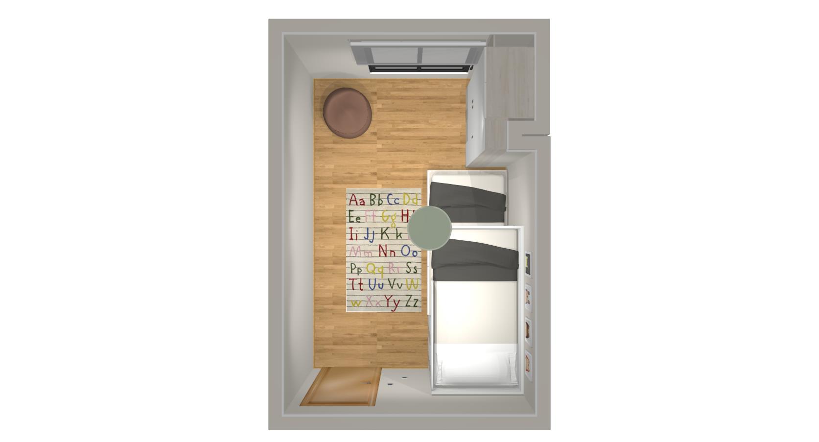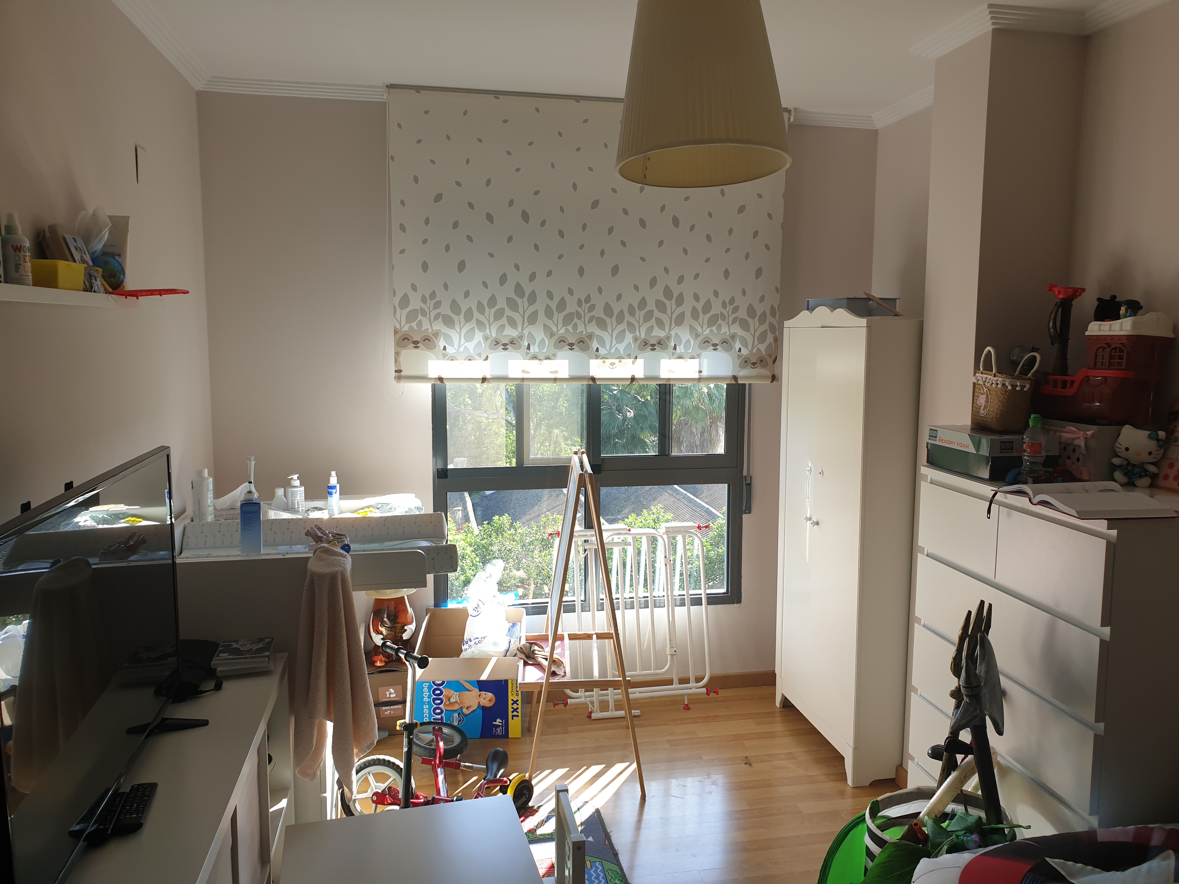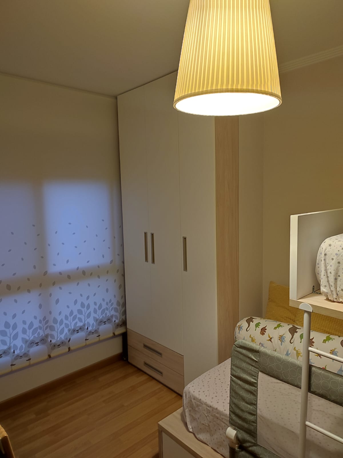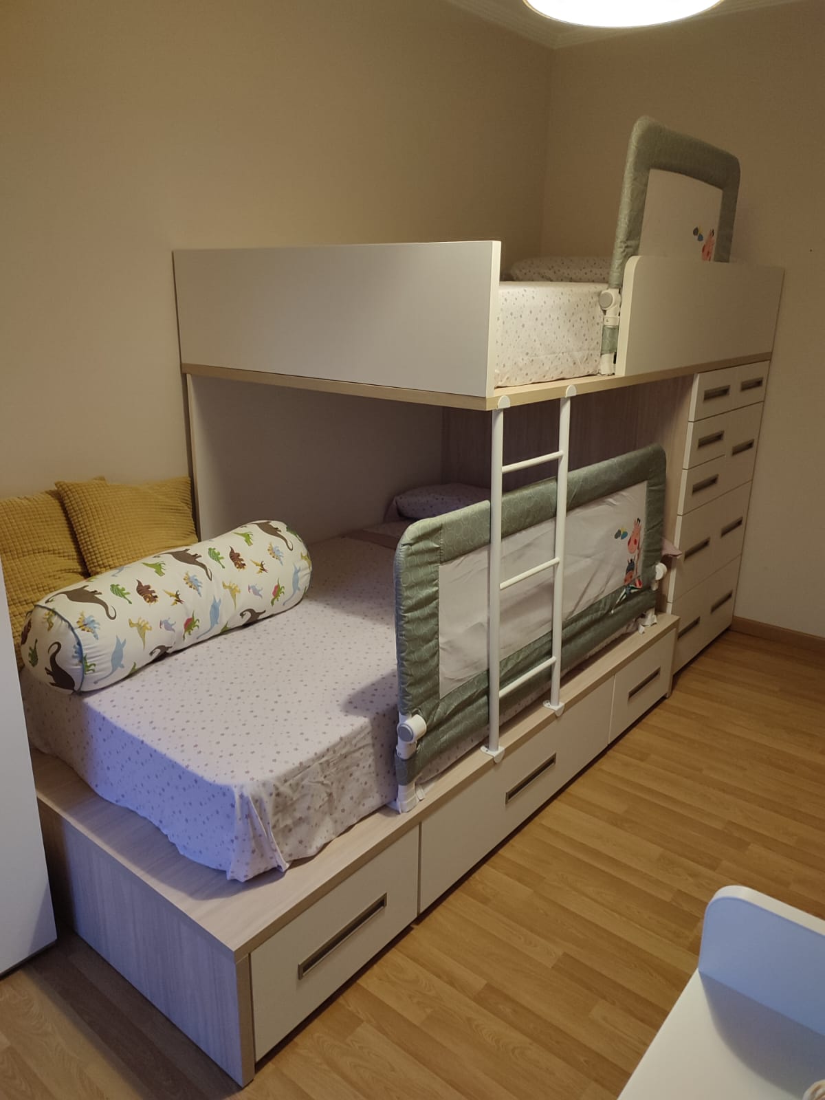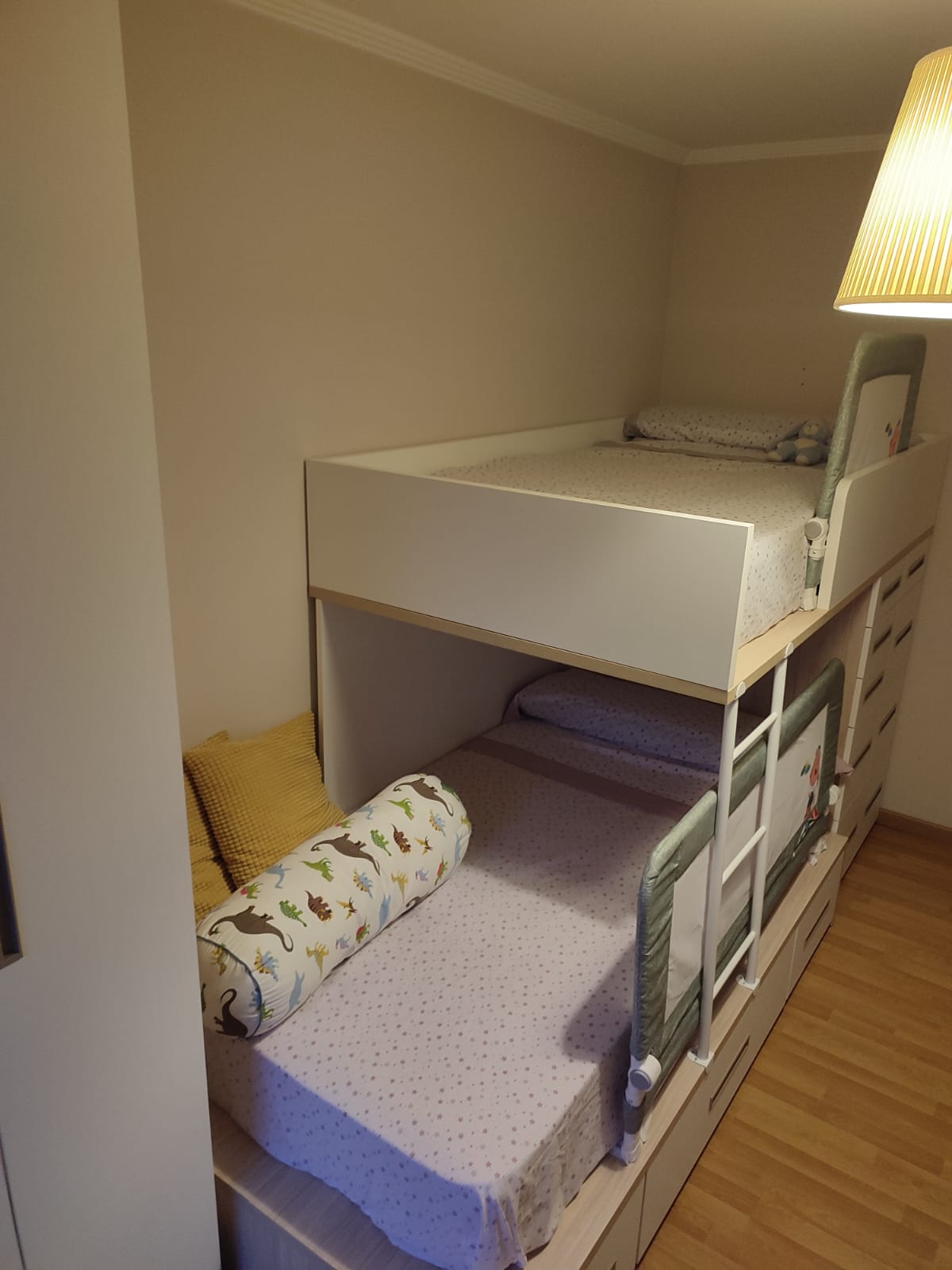 Para el mismo hemos tenido en cuenta la adecuación de dos camas grandes 1.05 x 2.00m. tipo litera tren, en dos alturas, con multitud de cajones y contenedores. Asimismo se ha ajustado, a los pies de las camas, un amplio armario a medida el cual se ha cajeado a un pilar y también se ha tenido en cuenta la rejilla del retorno del aire acondicionado, empotrando la misma a un falseo necesario igualmente para la apertura de la persiana y el estor o cortina.