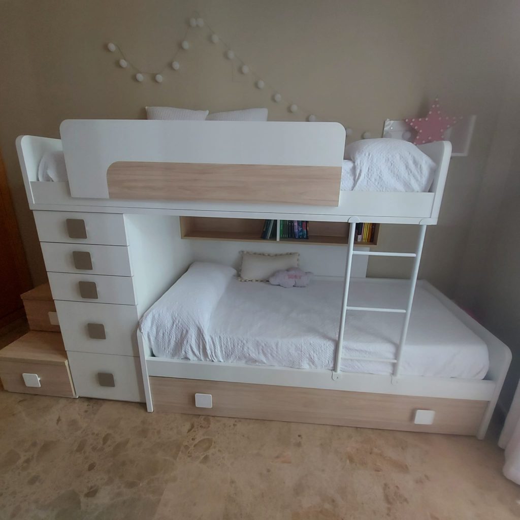 Buenos días a todos. Hoy os dejamos con otra de nuestra últimas instalaciones y su proyecto 3D previo. Se trata de un dormitorio juvenil moderno con doble cama tipo litera-tren al cual se le ha añadido una escalera lateral con cajones y puerta para el acceso a la cama superior. Junto esta se ha ubicado un estante de pared muy funcional y accesible.