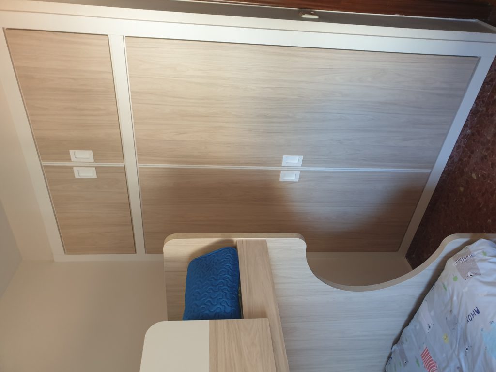 Se ha dispuesto pues de una litera con cajones inferiores al que se le ha habilitado una escalera de cajones en un lateral para el acceso a la cama superior.