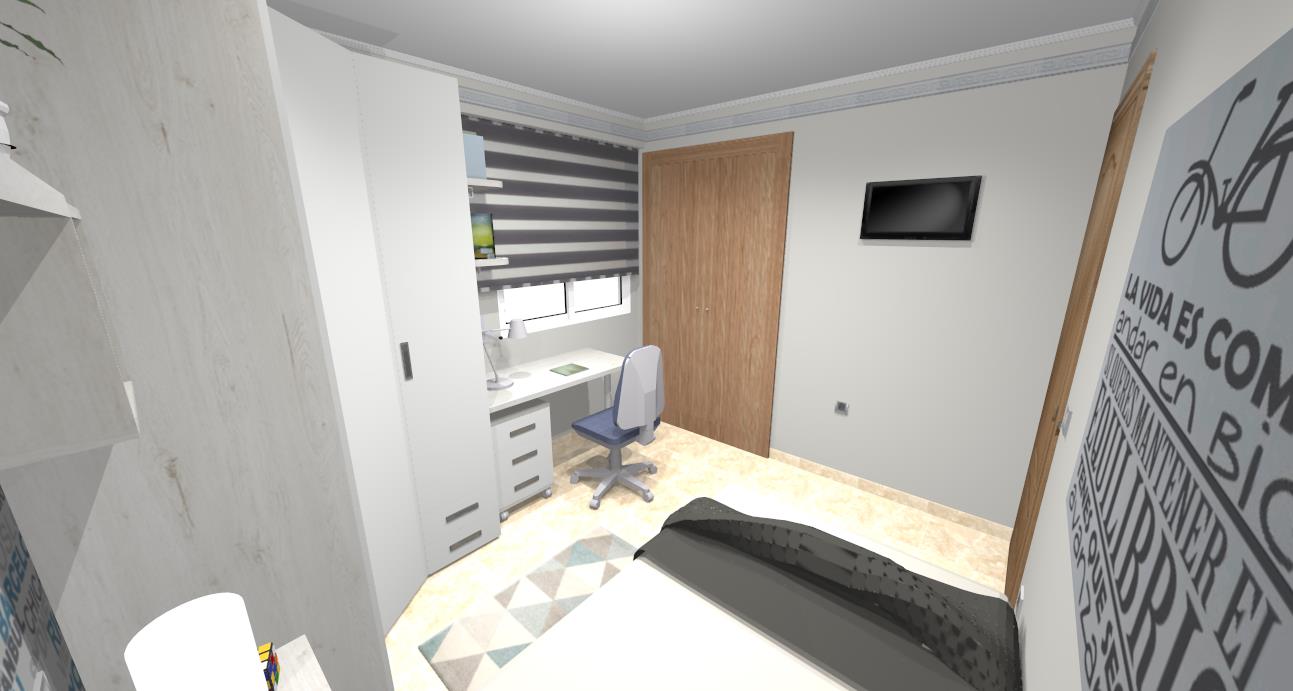Como siempre hemos tenido en cuenta las necesidades de nuestro cliente, que en este caso, priorizaba el tener un buen armario con una zona estudio y una cama de 1.05 X 190 con canapé abatible tapizado.