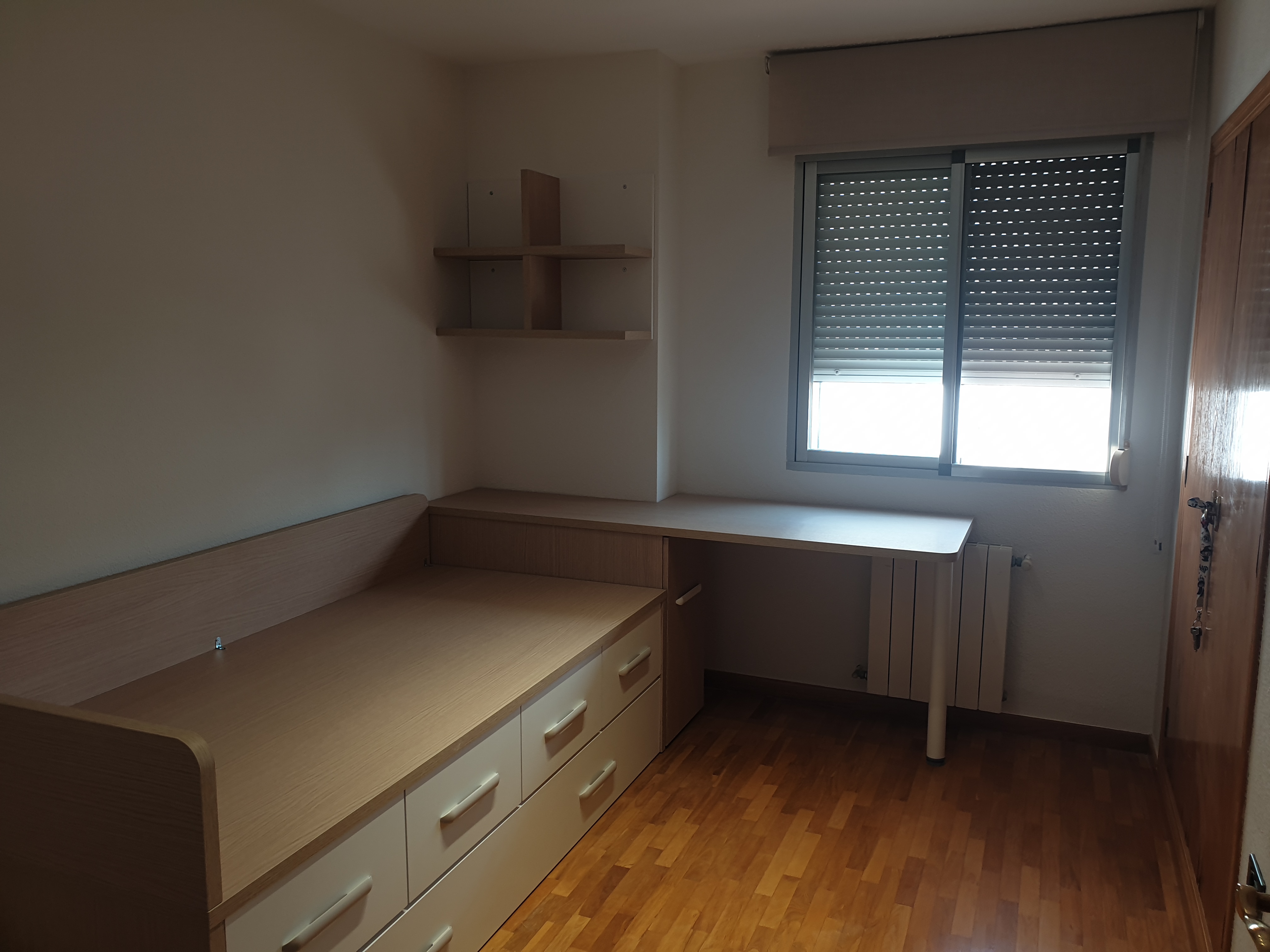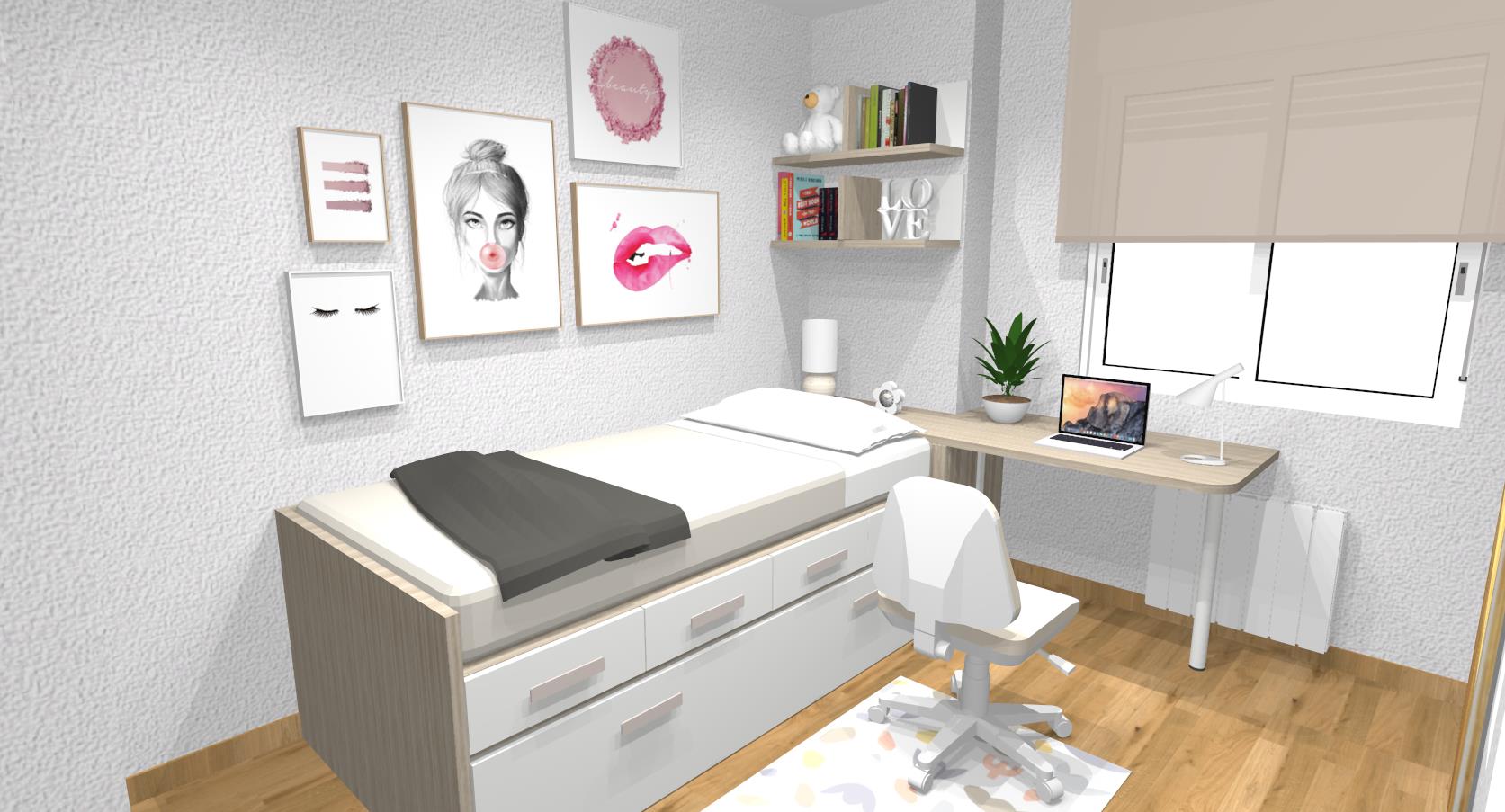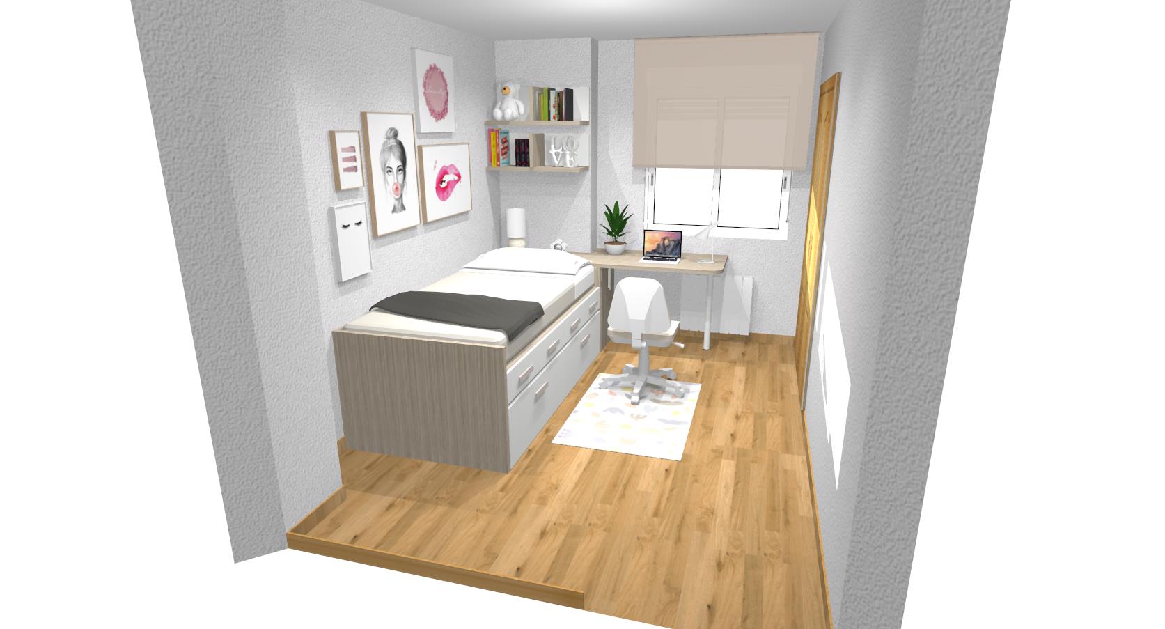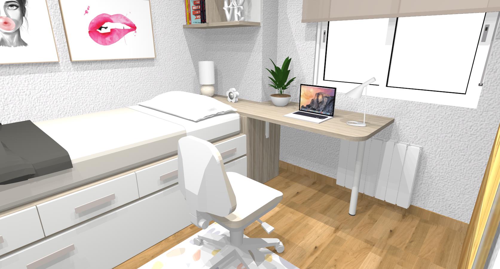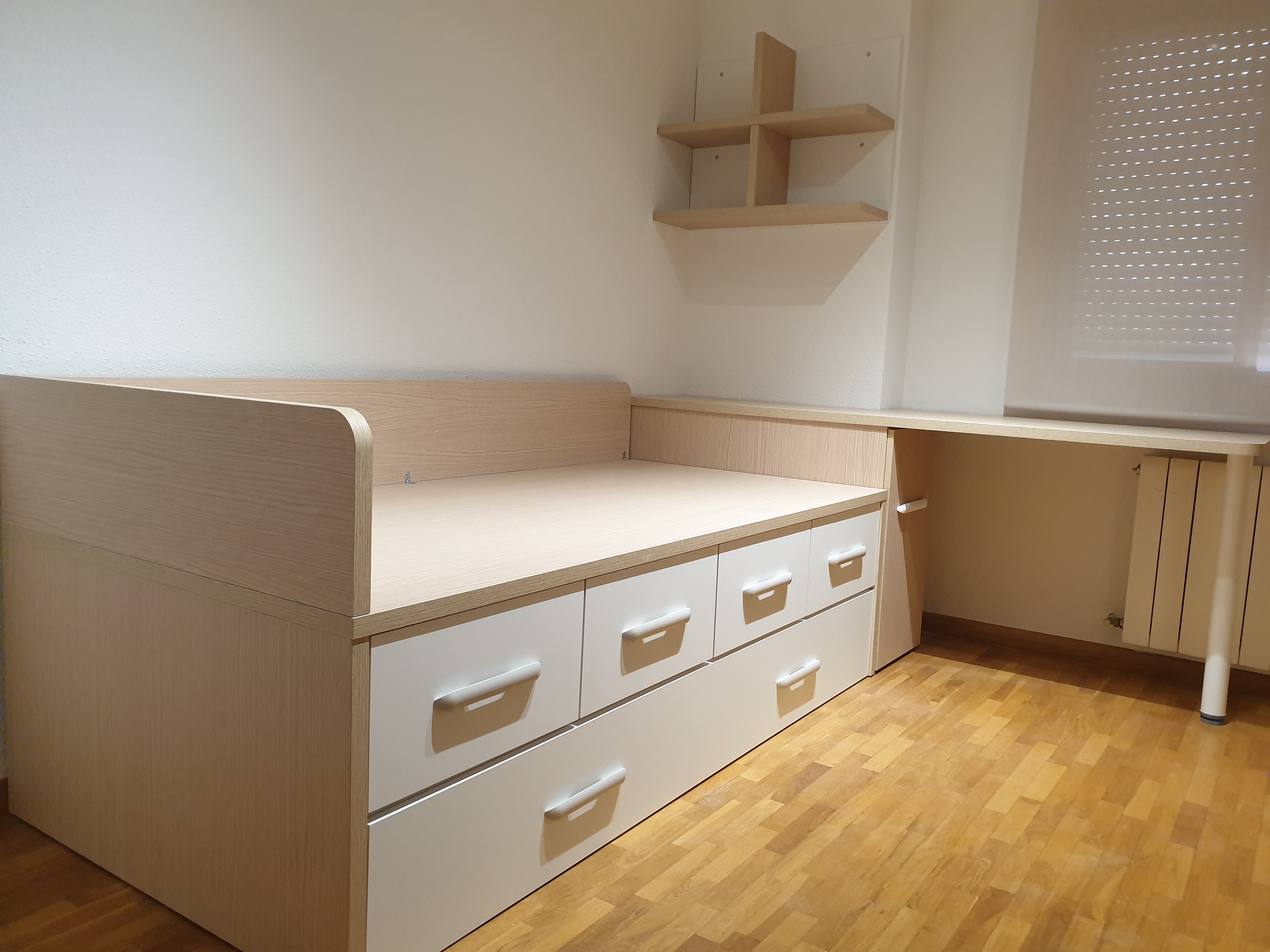 Se ha priorizado la adecuación de una cama doble con cajones contenedor en la zona intermedia y un escritorio con arcón el cual hemos realizado a medida para poder adaptarlo a un pilar en la zona del cabezal. Además se ha tenido en cuenta la apertura del armario empotrado para lo que hemos redondeado la esquina para un mejor acceso al mismo y también el radiador por lo que le hemos dotado de mayor altura para un óptimo desahogo del calor.