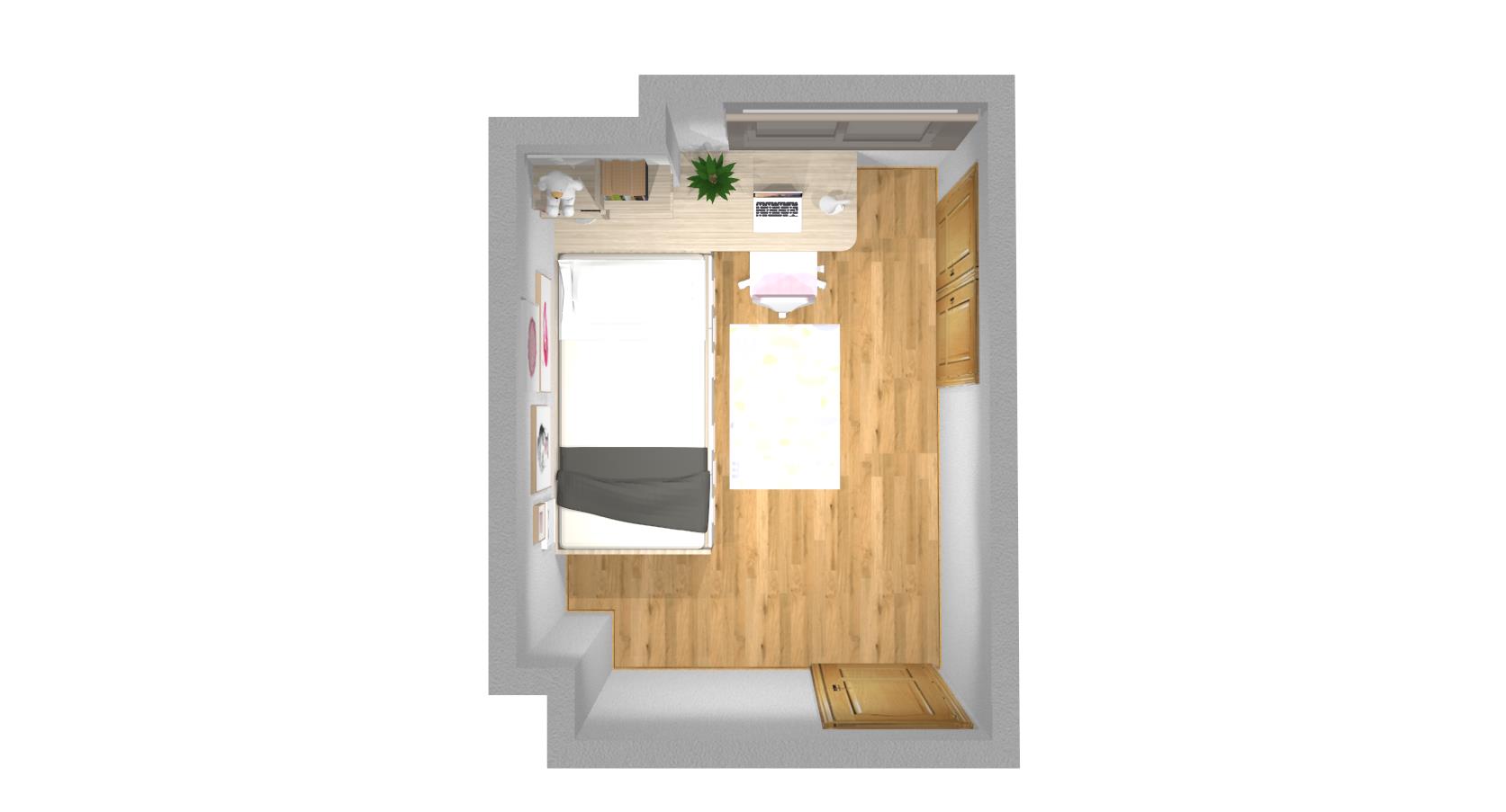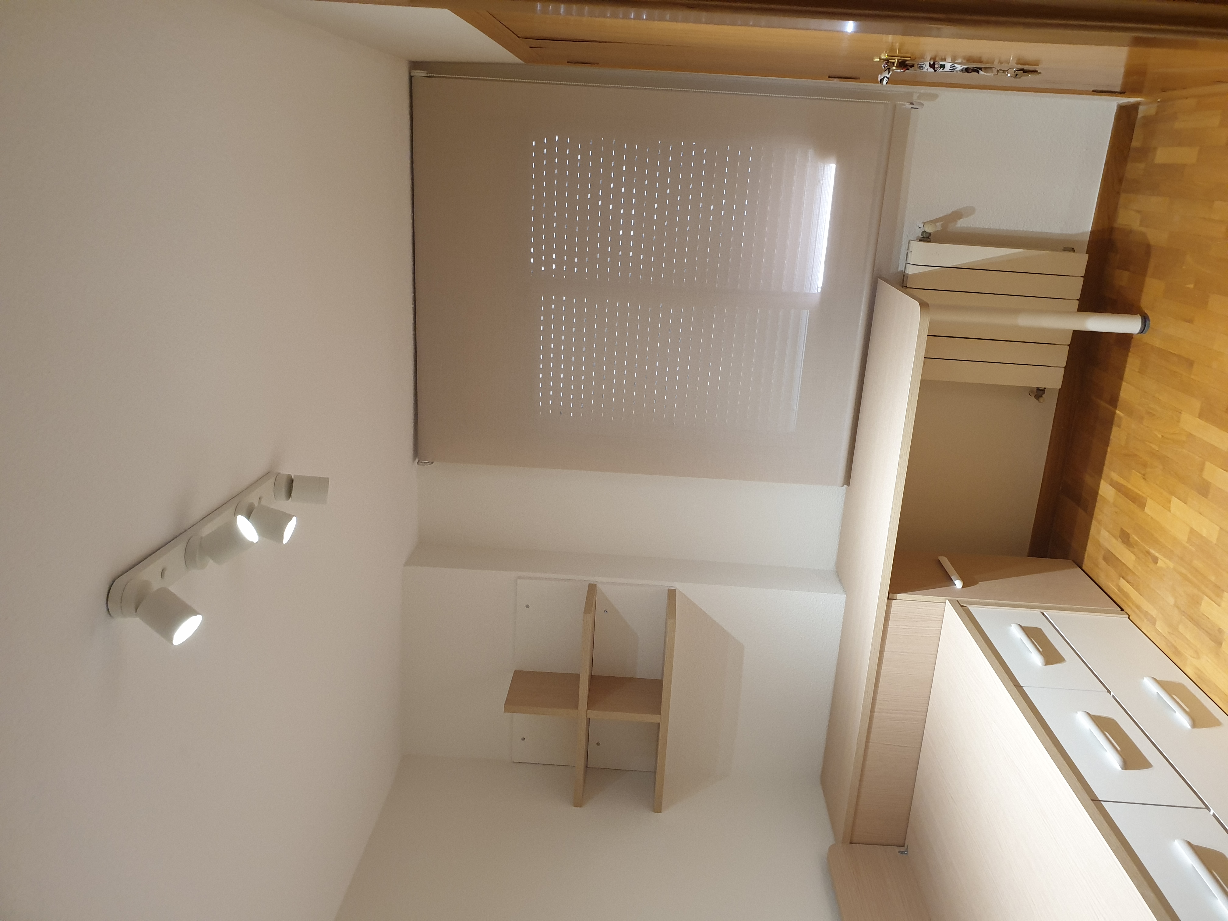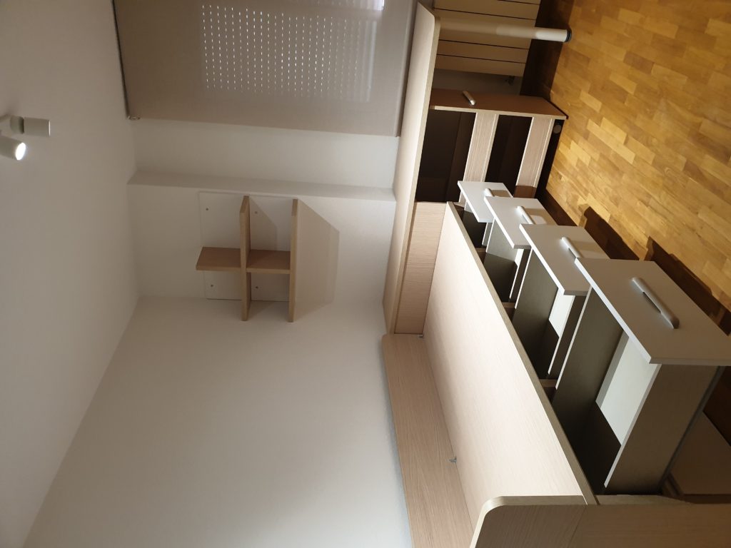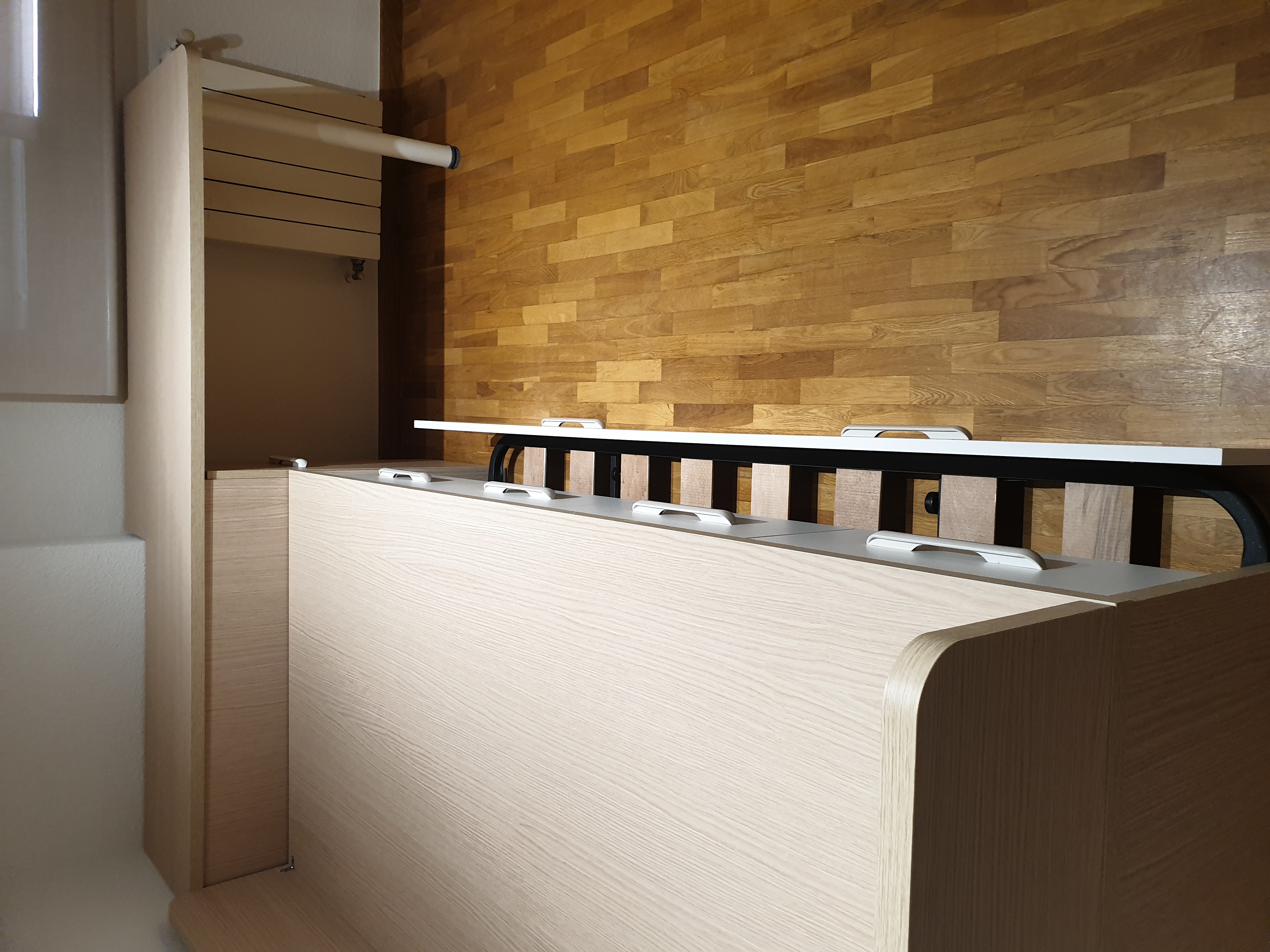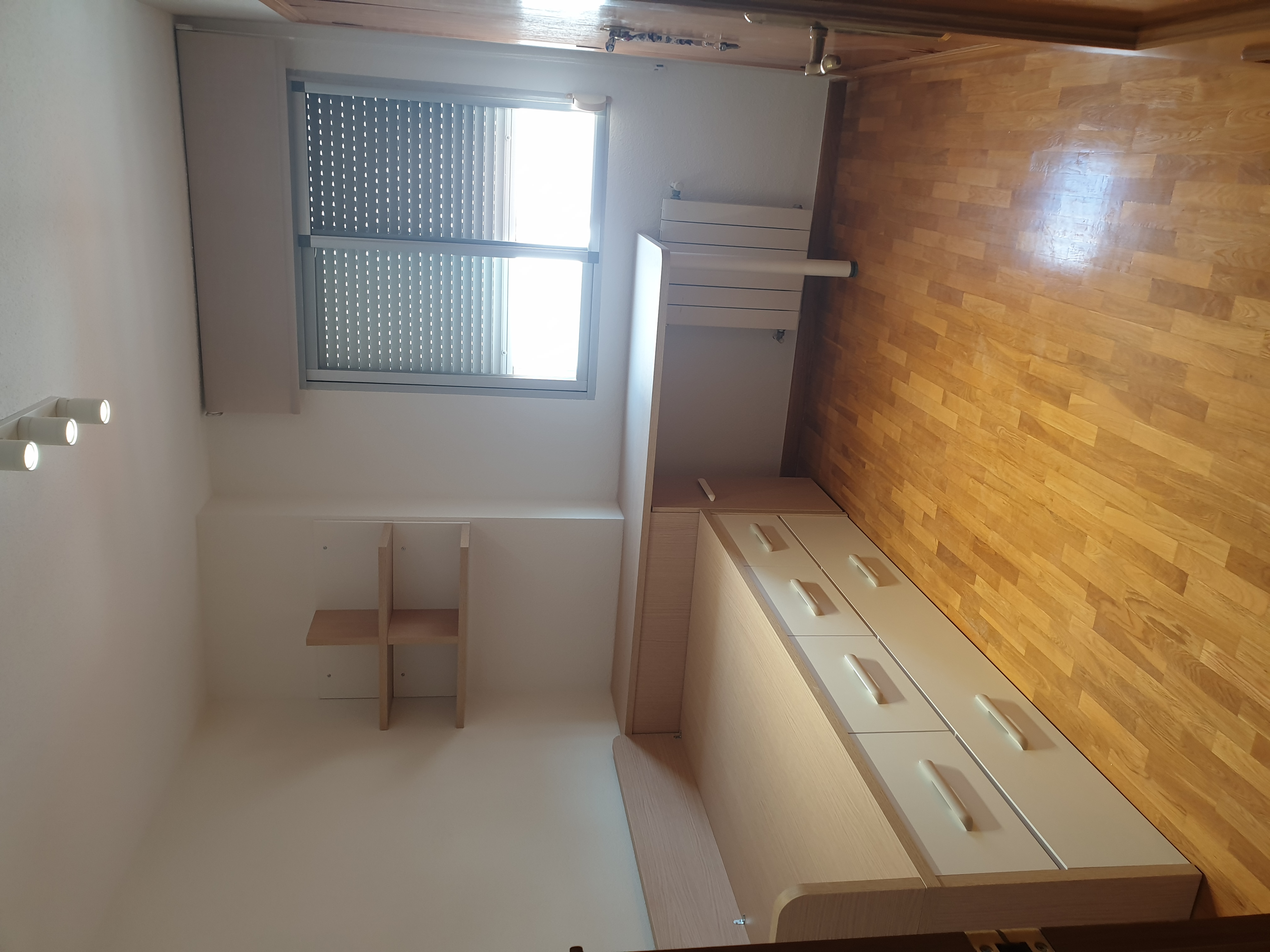 Se ha priorizado la adecuación de una cama doble con cajones contenedor en la zona intermedia y un escritorio con arcón el cual hemos realizado a medida para poder adaptarlo a un pilar en la zona del cabezal. Además se ha tenido en cuenta la apertura del armario empotrado para lo que hemos redondeado la esquina para un mejor acceso al mismo y también el radiador por lo que le hemos dotado de mayor altura para un óptimo desahogo del calor.