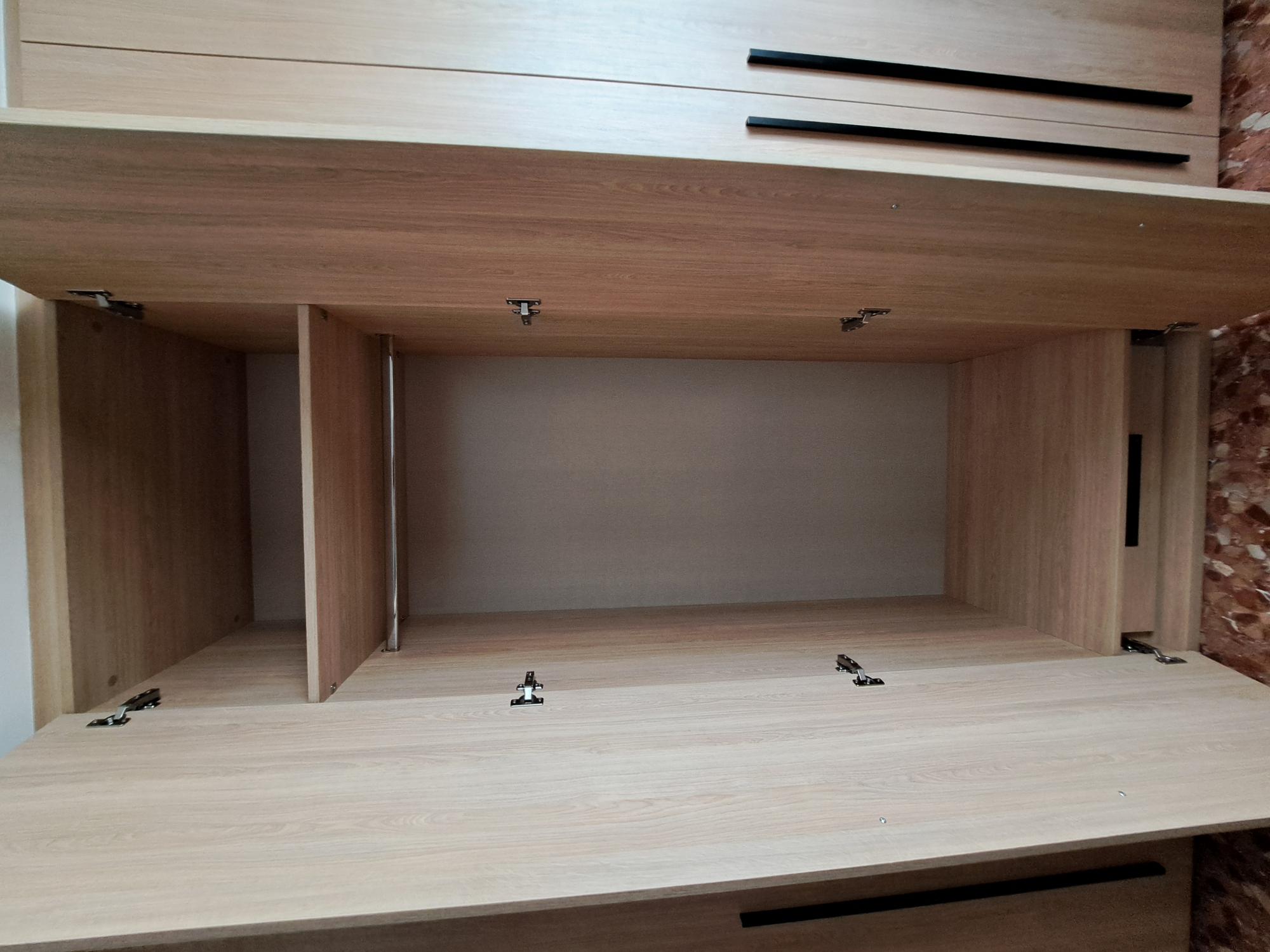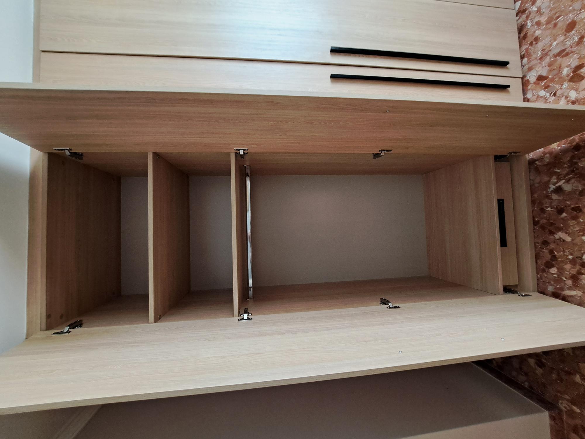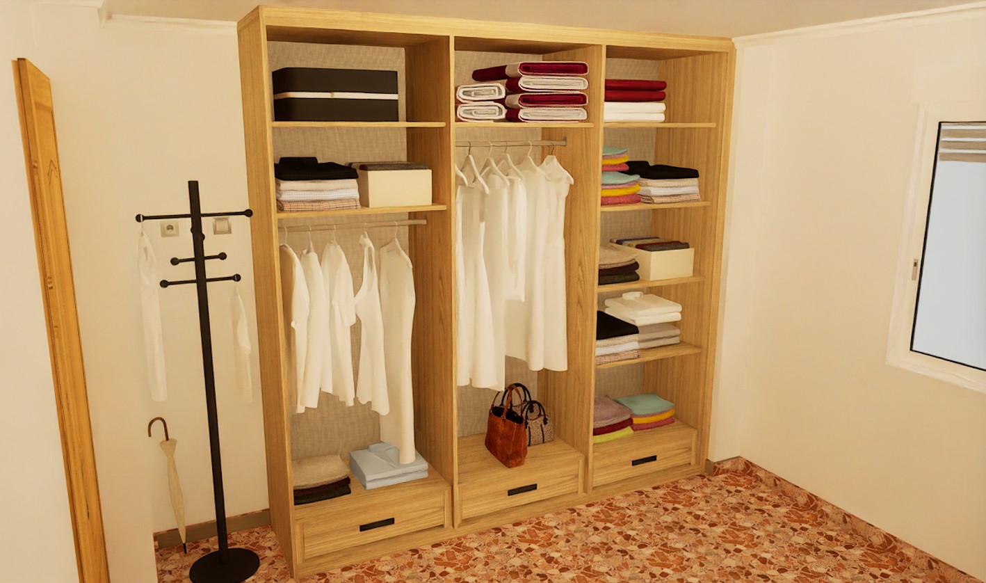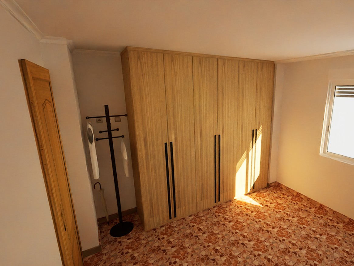 Hoy os dejamos con la instalación junto el proyecto previo en 3D de un armario a medida de 6 puertas batientes con unos bonitos tiradores largos en negro. Para el conjunto hemos optado por un acabado roble. Como siempre hemos personalizado el interior según las necesidades de nuestro cliente, en este caso, con multitud de estantes.