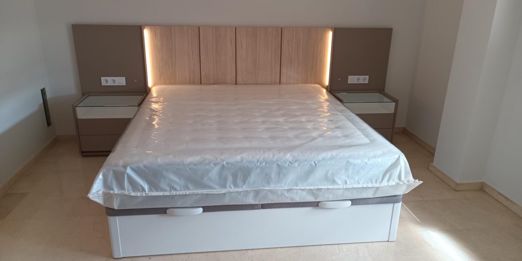 Se trata de un cabezal con paneles y luces led a medida junto a un buen conjunto de descanso compuesto por un canapé de 1.80m. de ancho x 2.00m. de largo más un colchón de muelle ensacado y viscoinnogel con almohadas visco y fundas transpirables e impermeables con fibras naturales.